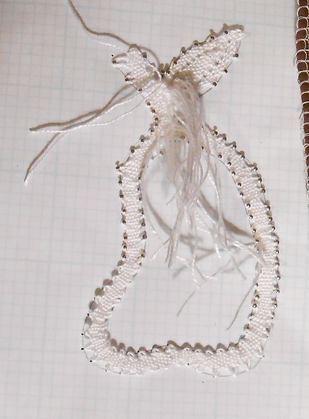 This is a tape lace that is laid out in the shape of a pear. With just 5 pairs of bobbins (9 for the leaf), you work around the shape using a cloth stitch. Many of the patterns have filler patterns for the middle but since I'd never done this type of work before, I just made the shape with the leaf. While you're working, what you see is the back of the work. Once it's done, you take out all the pins, trim all the ends and turn it over. You get this: